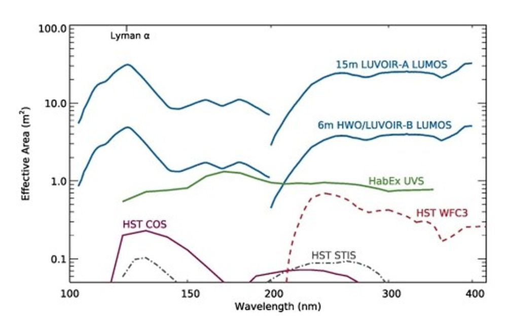 This determine compares HWO’s UV spectroscopy to that of different telescopes/devices. The HWO’s LUMOS instrument would have an efficient wavelength protection space ten instances bigger than the Hubble House Telescope’s Cosmic Origins Spectrograph and House Telescope Imaging Spectrograph. Picture Credit score: Dos Santos and Lopez 2025.
