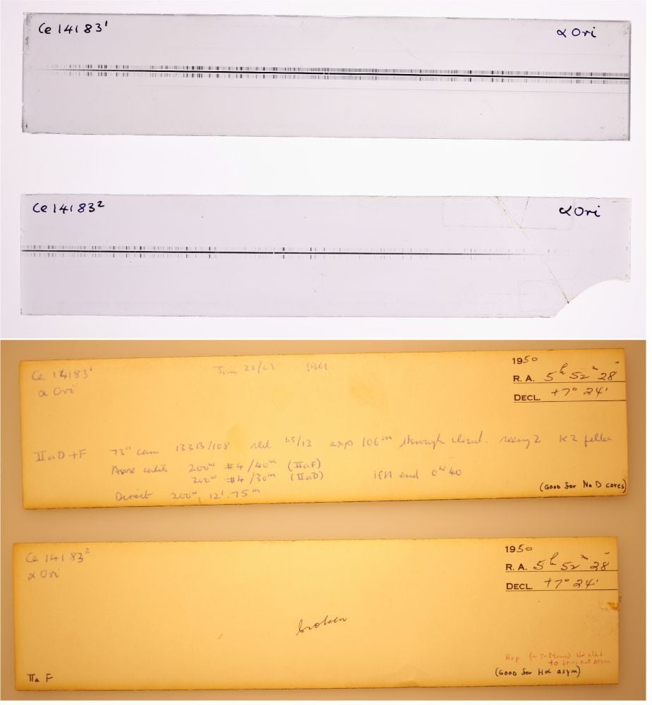 That is what astronomical knowledge regarded like earlier than the pc age. They’re crimson and blue spectral plates quantity 14183 from The Carnegie Science Plate Archive, taken with the Coude spectrograph on Mt. Wilson 1961 January 22 (R. Weymann 1962). Pictures are offered courtesy of Carnegie Science.