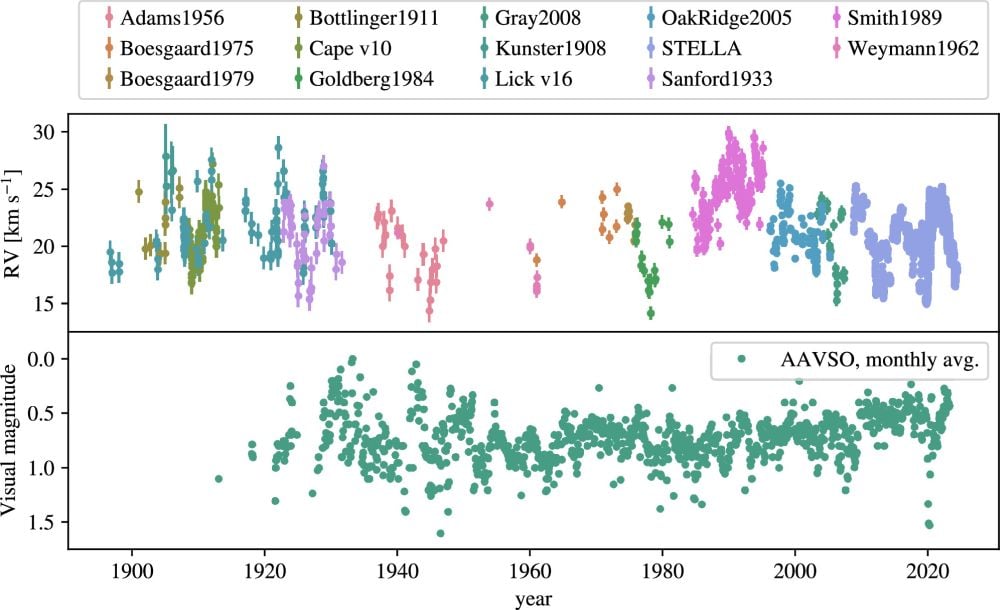This new discovery is predicated on observational knowledge acquired during the last century by completely different ground-based and space-based telescopes. Observations with Gemini North’s Alpeke instrument capped it off. “We study a century of radial velocity, visible magnitude, and astrometric observations of the closest crimson supergiant, Betelgeuse, so as to reexamine the century-old assertion that Betelgeuse is likely to be a spectroscopic binary,” the authors write.