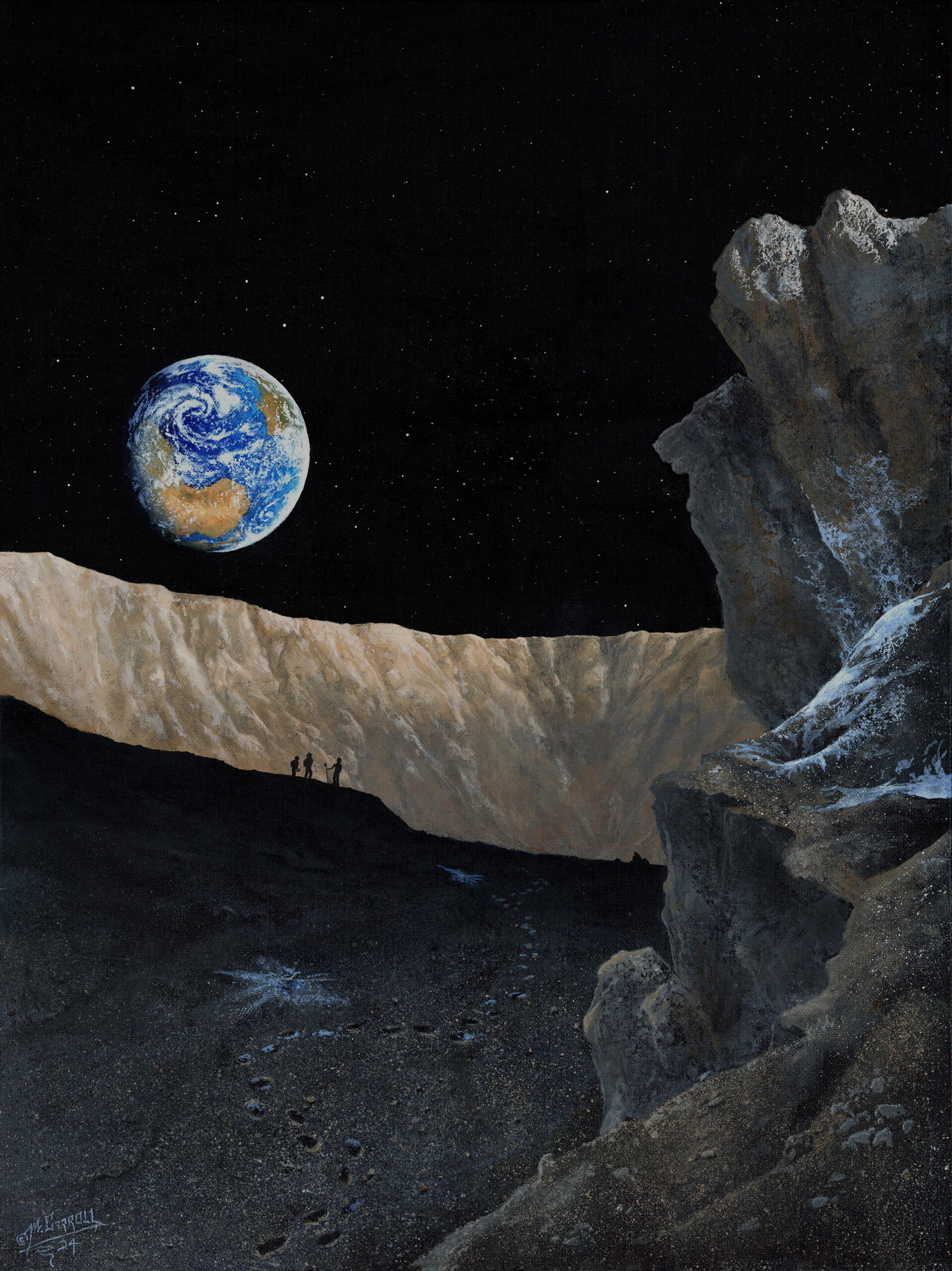 Astronauts survey a shadowed crater flooring, trying to find water deposits, on this illustration. Analysis has proven that completely shadowed areas close to the north and south lunar poles may maintain water ice in addition to scientific riches. Credit score: Michael Carroll