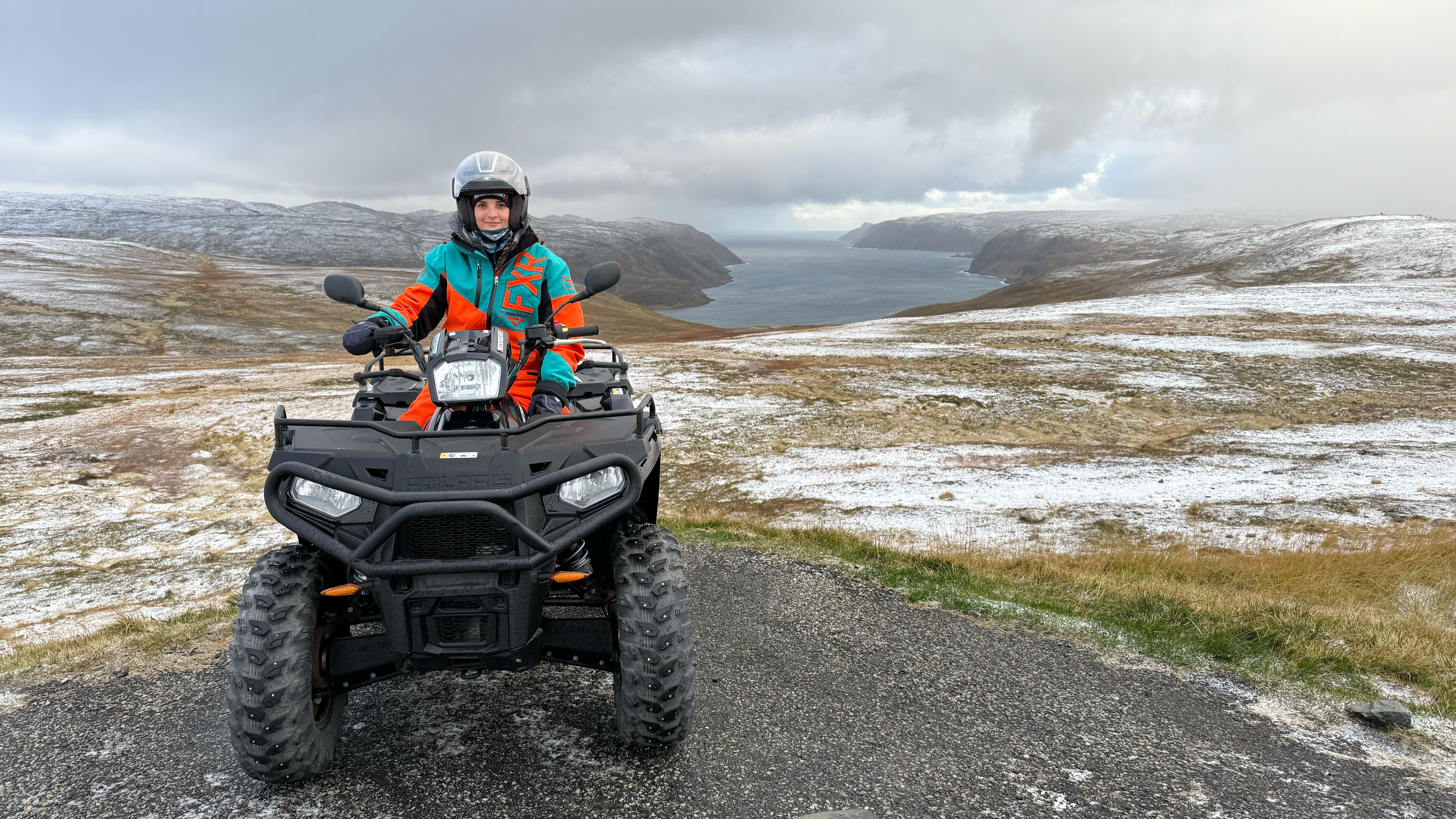 a woman sits on an ATV and smiles, there is windswept, snow-dusted landscape in the background.