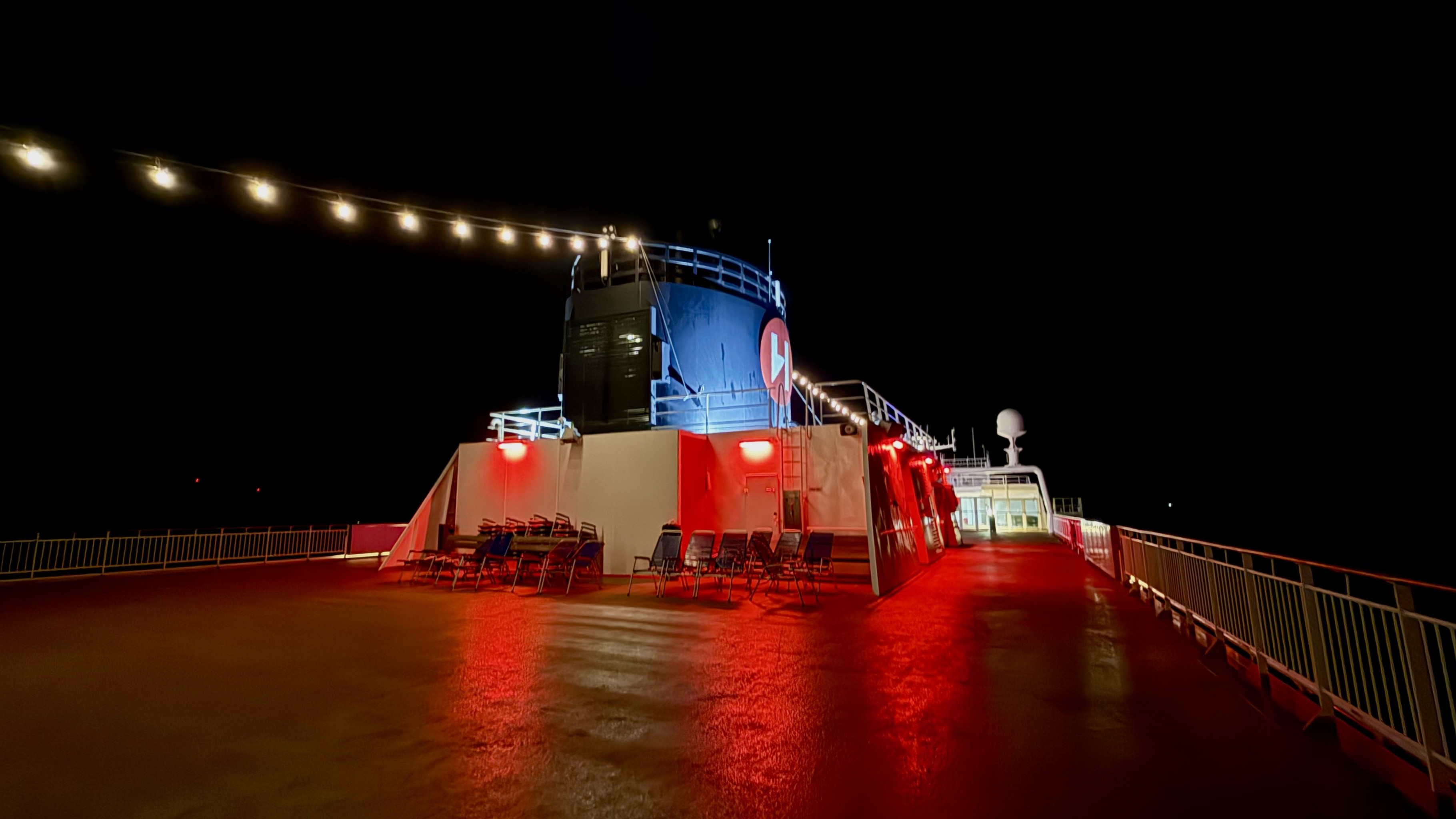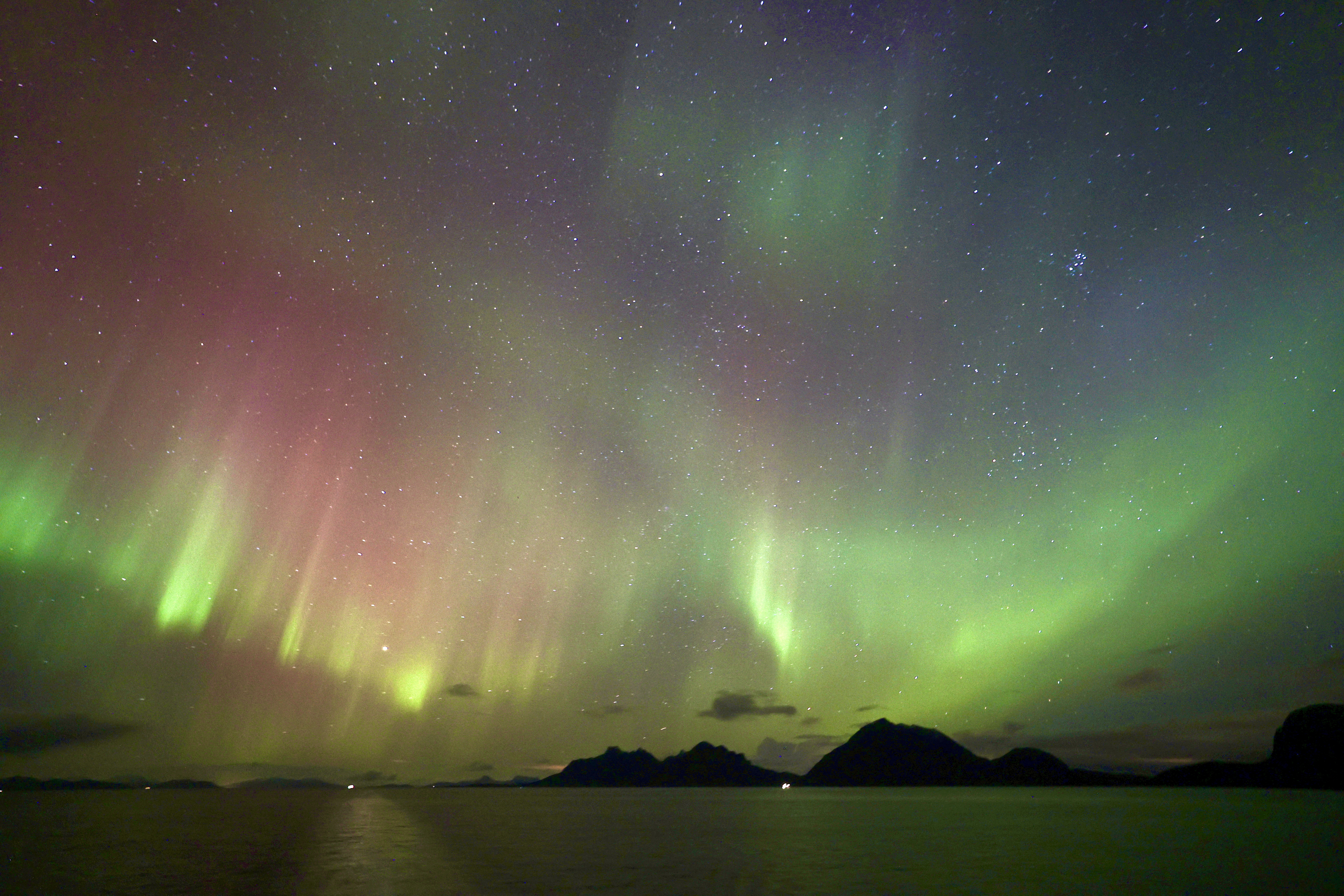 But I couldn’t fully relax, I still had one eye on the aurora forecast and another on the radar satellite imagery telling me we were heading towards some relatively clear skies. I had a peek outside. I spotted a telltale sign of something stirring as a milky green band whipped across the sky. This was it. I ran downstairs, donned my warm clothes and dashed back out on deck, camera in hand. It didn’t take long for the deck to turn into a tiny festival, gasps, cheers and the soft click of a hundred shutters. The faint green band grows brighter, stretching across the sky and dancing to the whims of Earth’s magnetic field. Then comes the color. The waxing and waning of the substorm conditions fuel auroras all night, keeping us spellbound for hours.