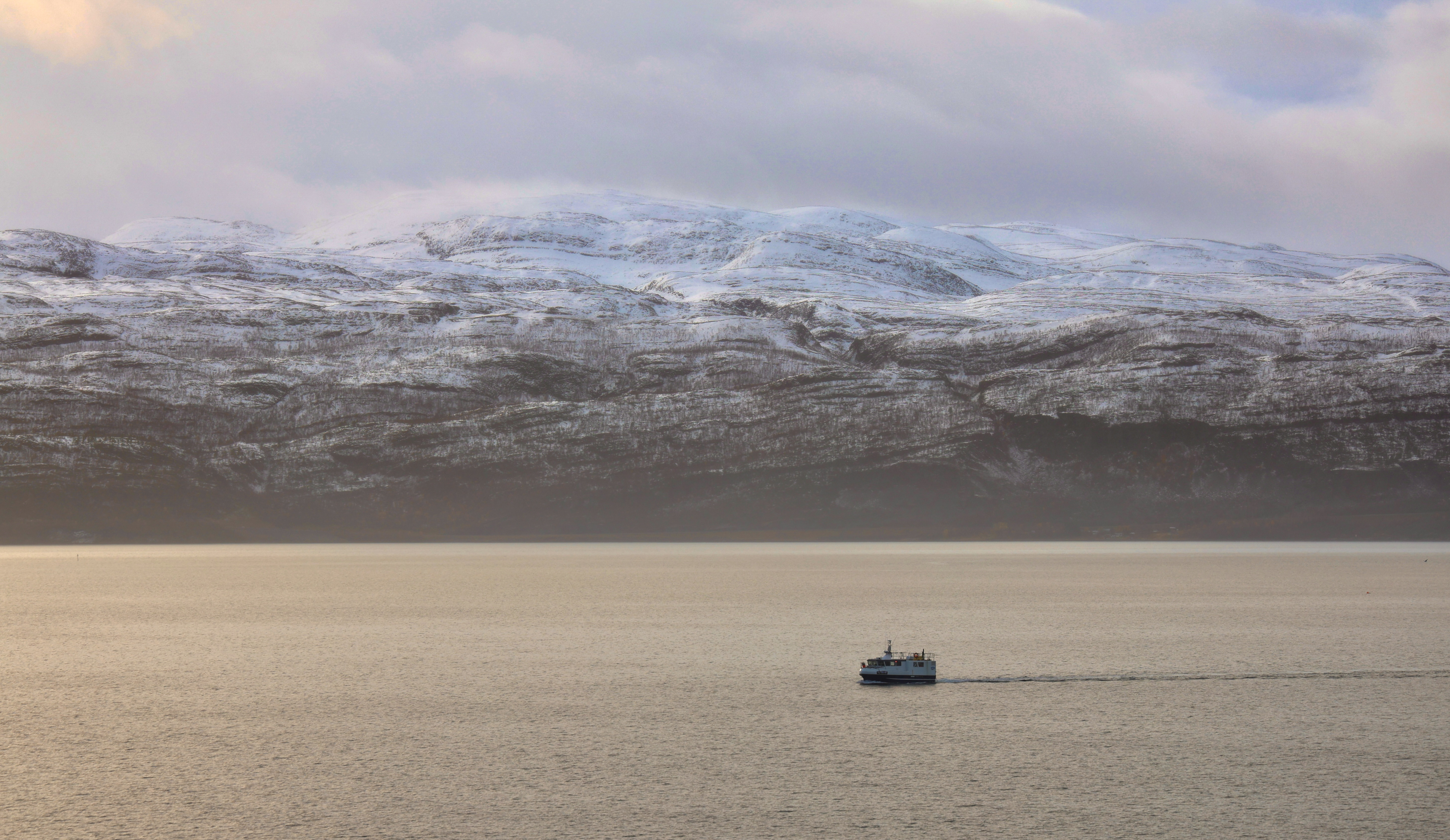 High above the Arctic Circle, Alta is known as the “city of the northern lights,” a place where auroras often dance overhead for the 21,000 who call Alta their home. As we approach, morning begins to break and Alta’s shoreline flickers with houselights glowing like candles.