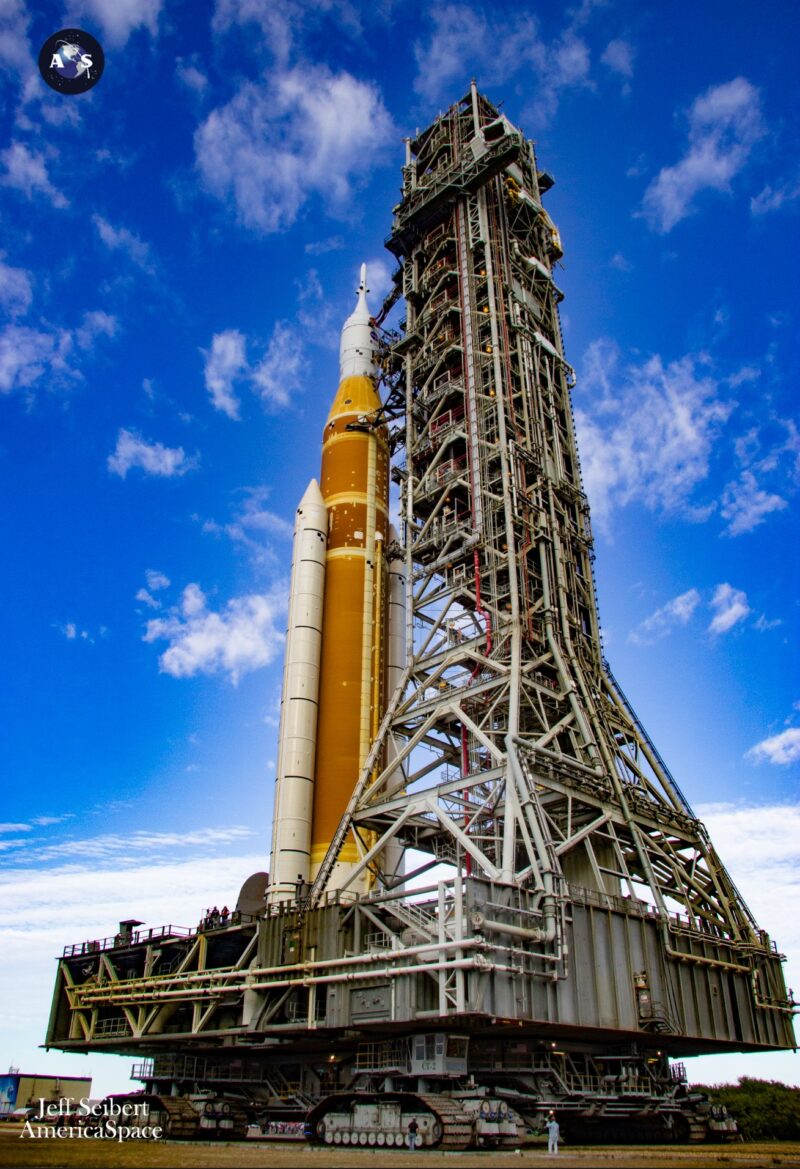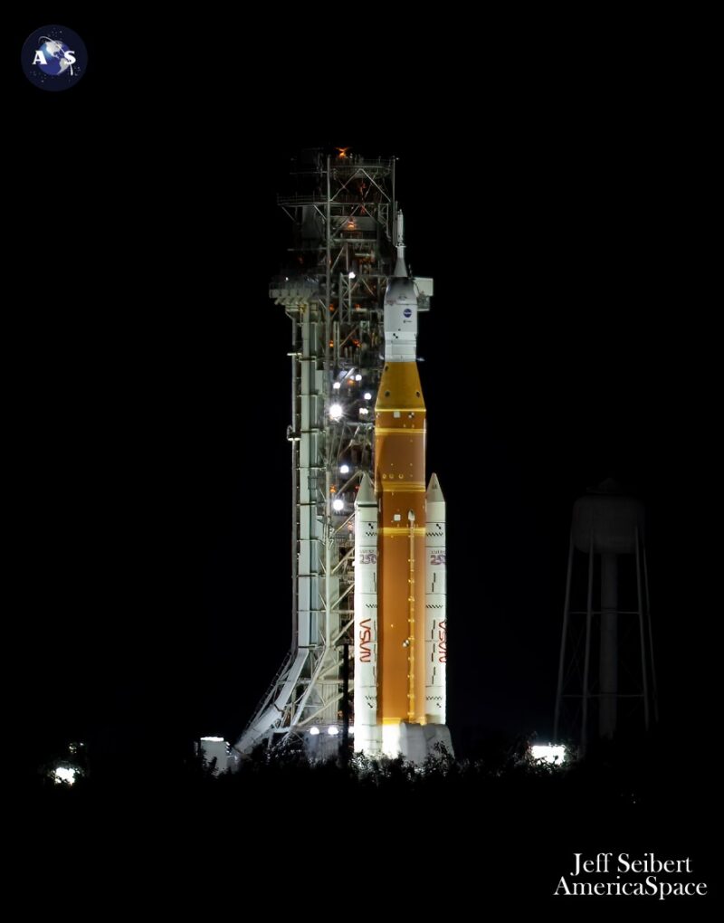 Artemis-2 on pad 39B for moist costume rehearsal. Photograph: AmericaSpace / Jeff Seibert
