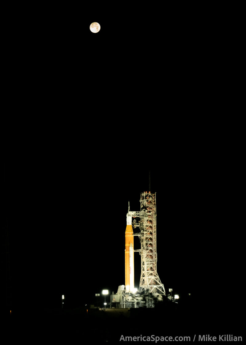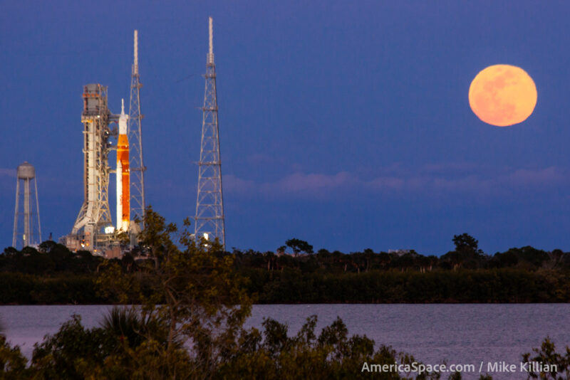 Launch and vacation spot, the total moon rising 230,000 miles away as Artemis-2 awaits moist costume rehearsal for launch. Photograph: AmericaSpace / Mike Killian