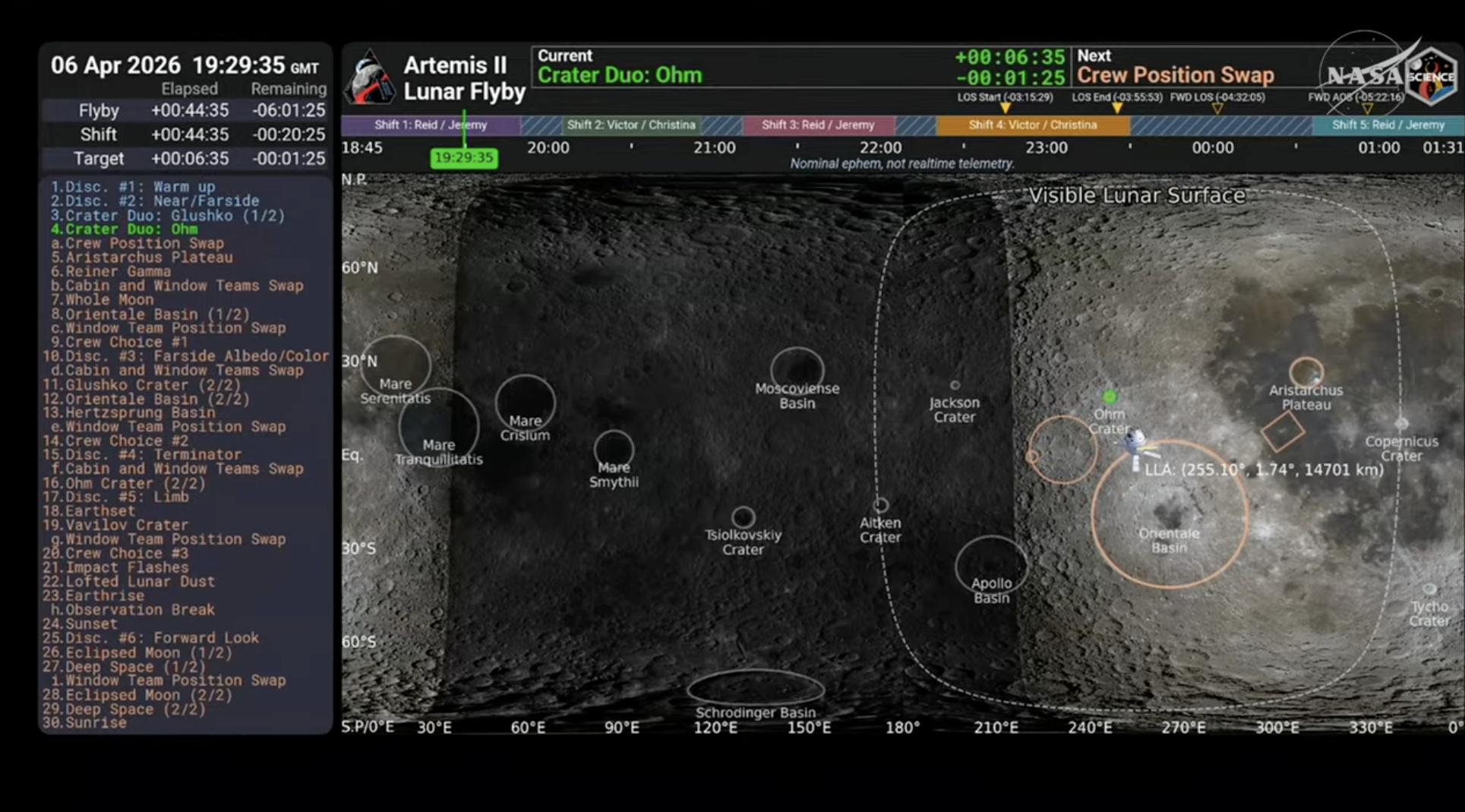 3:29 p.m. EDT: The Artemis 2 craft is presently simply northwest of Orientale Basin and east of Ohm Crater. The crew is working by way of observations of Orientale, Aristarchus Plateau, Ohm, and the mysterious swirl of Reiner Gamma.